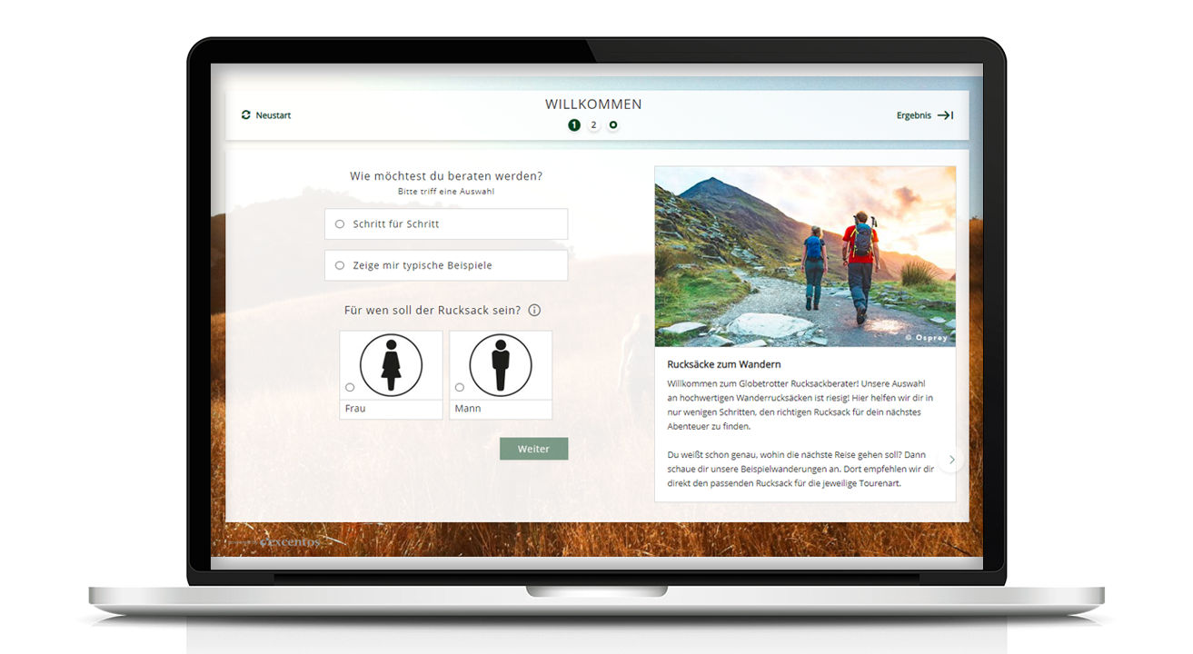 The key to provide every customer with perfectly matching recommendations is Digital Product Advice: Product Guides provide customer journeys modeled with your sales expert's knowledge that interactively engages each customer with a dynamic question flow. It allows you to tailor the questions to every user's experience and present relevant topics only - thus a beginner's advisor flow can be very different from expert advice for outdoor geeks.
